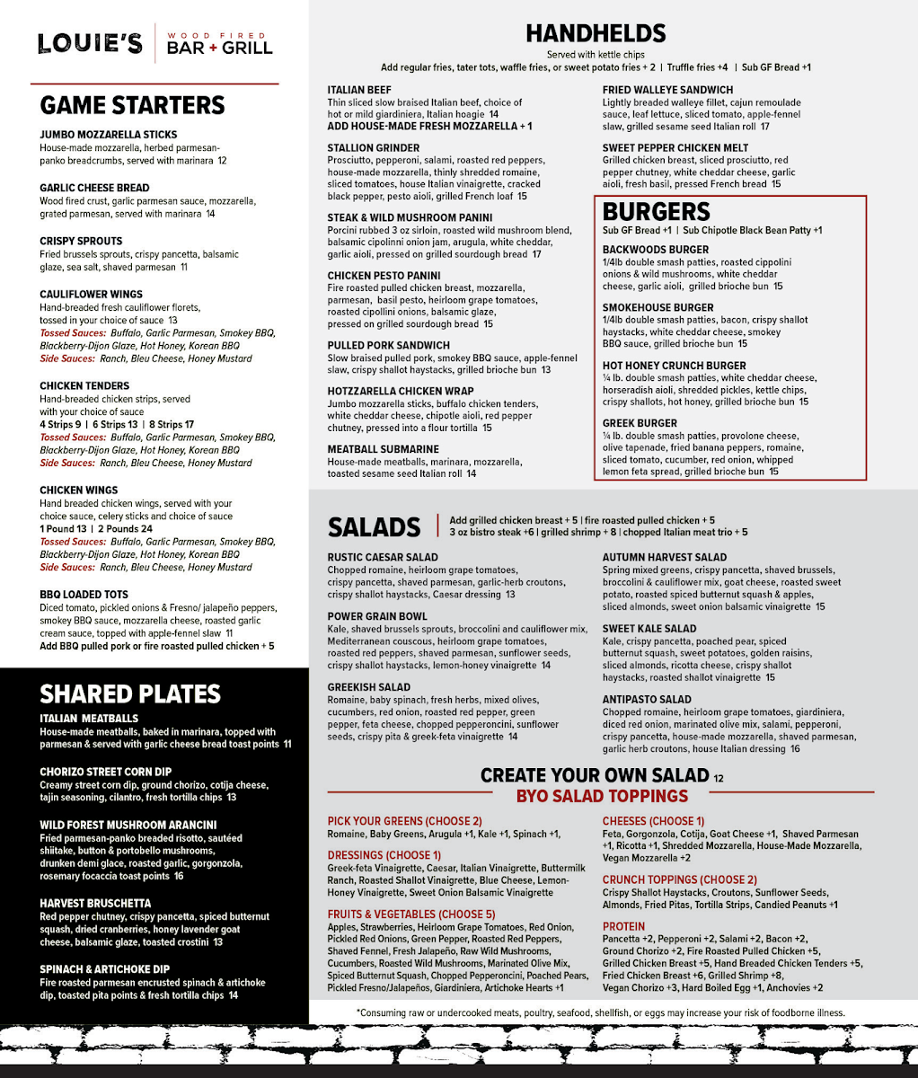 Louie’s Wood Fired Bar & Grill offers an inviting and diverse menu that promises something for every palate, with a selection that spans from hearty starters to mouthwatering entrees, accompanied by carefully curated drinks and desserts. To kick off your meal, consider the Jumbo Mozzarella Sticks or the flavorful Garlic Cheese Bread. For something unique, try the Crispy Sprouts or Cauliflower Wings, both excellent choices for those looking for a lighter yet satisfying start. The Chicken Tenders are also a crowd-pleaser, perfect for sharing.