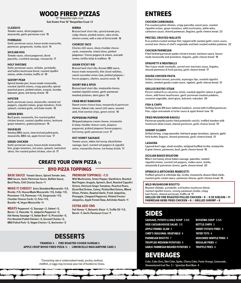 End your meal with a sweet note, choosing from desserts like the creamy Tiramisu, the indulgent Fire Roasted Cookie Sundae, or the seasonal Apple Crisp Wood Fired Pizza. The Limoncello Mascarpone Cake is another unique dessert that offers a citrusy finish.