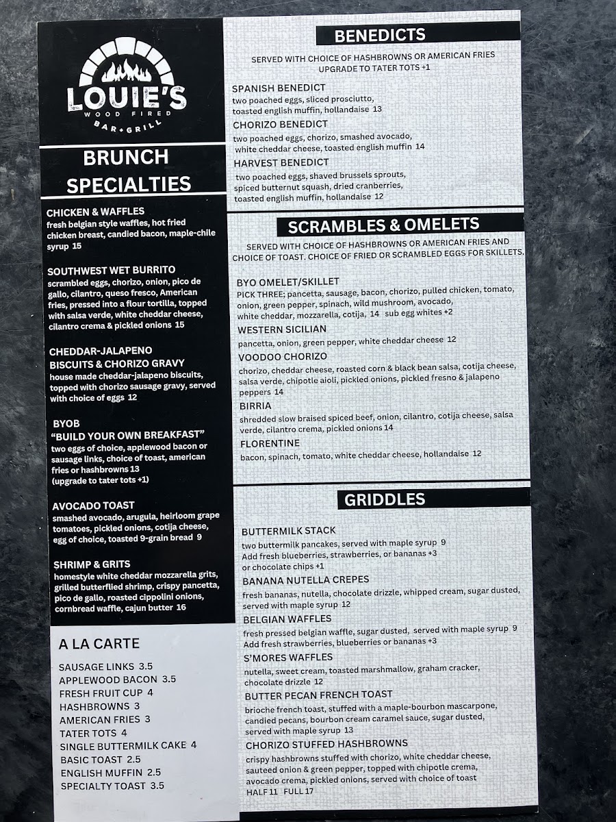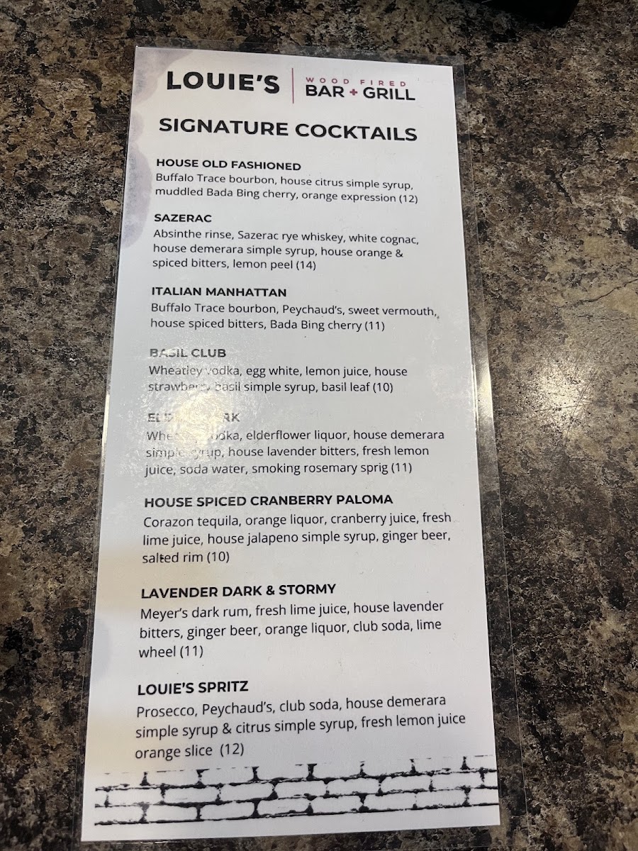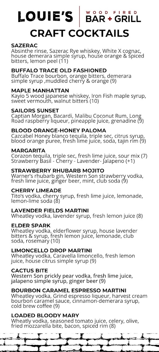 Overall, Louie’s Wood Fired Bar & Grill delivers a diverse and flavorful dining experience, where each dish is crafted with care and attention to detail. Whether you're indulging in a rich entrée or enjoying a refreshing cocktail, this menu is sure to leave you satisfied.